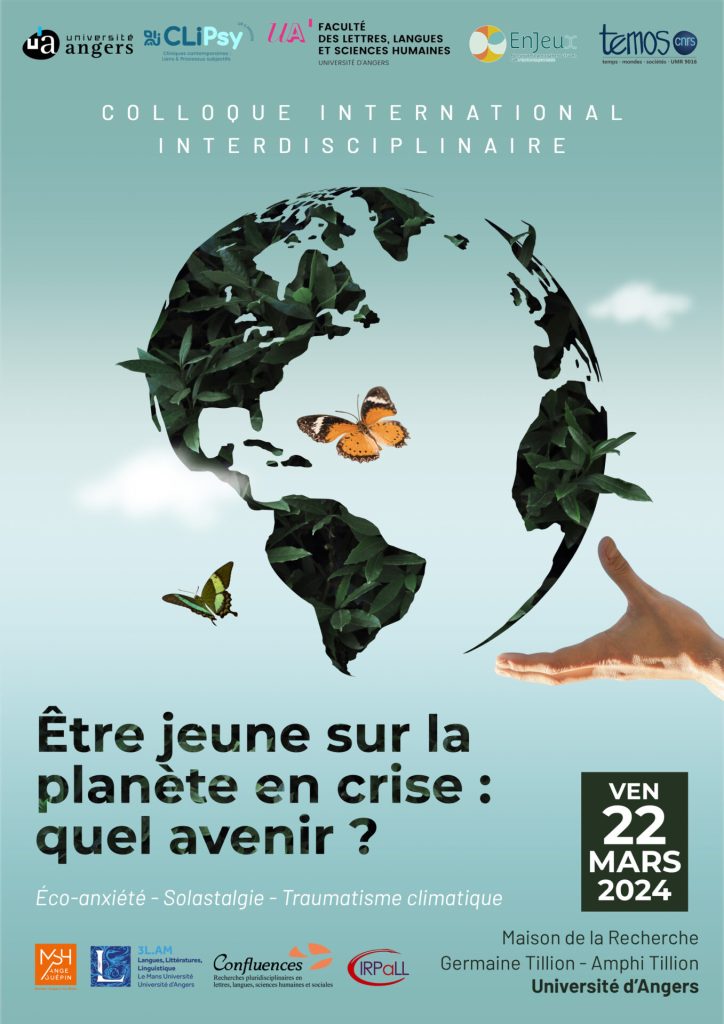 Le colloque donnera donc la parole aux chercheurs mais aussi directement aux jeunes dans une démarche de sciences participatives, avec un temps de forum étudiants. La problématique générale du colloque viendra interroger les représentations des jeunes concernant l’avenir de la planète et leurs influences sur le vécu psychologique, sur les liens aux autres et au monde, sur l’imaginaire et sur les expressions culturelles (ex : cinéma, littérature). La perspective prendra aussi en compte les enjeux historiques et géographiques.